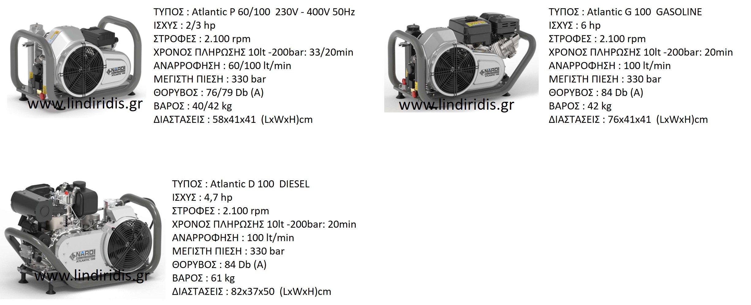 Μικρός σε μέγεθος αεροσυμπιεστής, με μεγάλη απόδοση. Είναι ο πιο συμπαγής από την κατηγορία Breathing Air, εύκολος στη μεταφορά με μικρό βάρος και επιτρέπει επαναφόρτιση ακόμα και σε δύσκολα σημεία, τόσο το ηλεκτροκίνητο μοντέλο Atlantic P όσο και το βενζινοκίνητο Atlantic G. Η ποιότητα του αέρα είναι πάντα πολύ υψηλή και διατίθεται σε 60 & 100 l/min, με μονοφασικό, τριφασικό ηλεκτροκινητήρα ή με κινητήρα εσωτερικής καύσης Robin-Subaru.