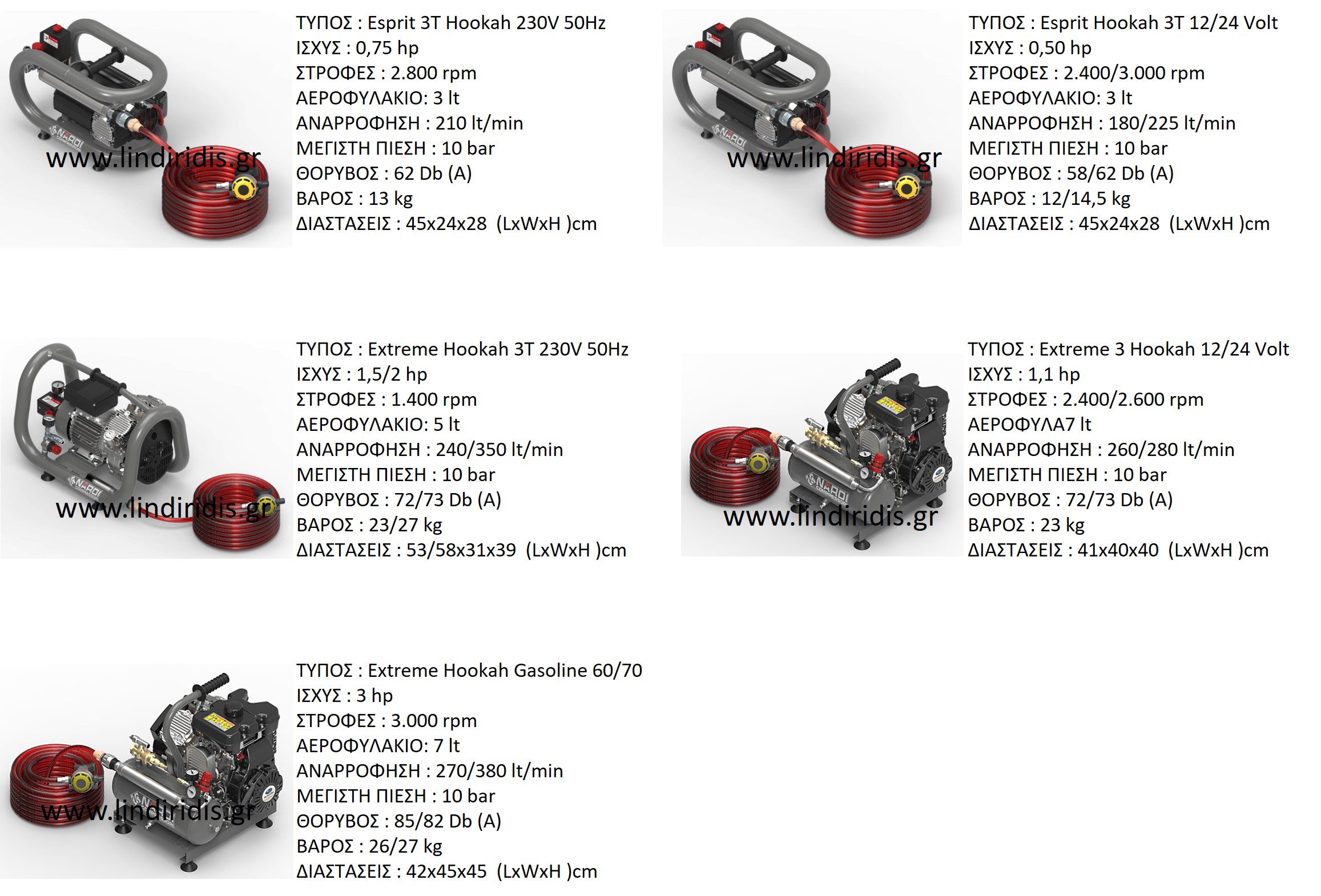 Μικροί, ισχυροί και αξιόπιστοι αεροσυμπιεστές, έτοιμοι για χρήση ανά πάσα στιγμή και για γρήγορη προετοιμασία. Τα μοντέλα συμπιεστών Hookah (Narghile) της Nardi παράγουν πεπιεσμένο αέρα μέχρι 10 bar, ο οποίος μειώνεται στην επιθυμητή πίεση για να προωθηθεί  μέσω φίλτρου ενεργού άνθρακα και να είναι τελικά έτοιμος να εισπνευστεί μέσω του παρεχόμενου διανεμητή και του σωλήνα σύνδεσης.
