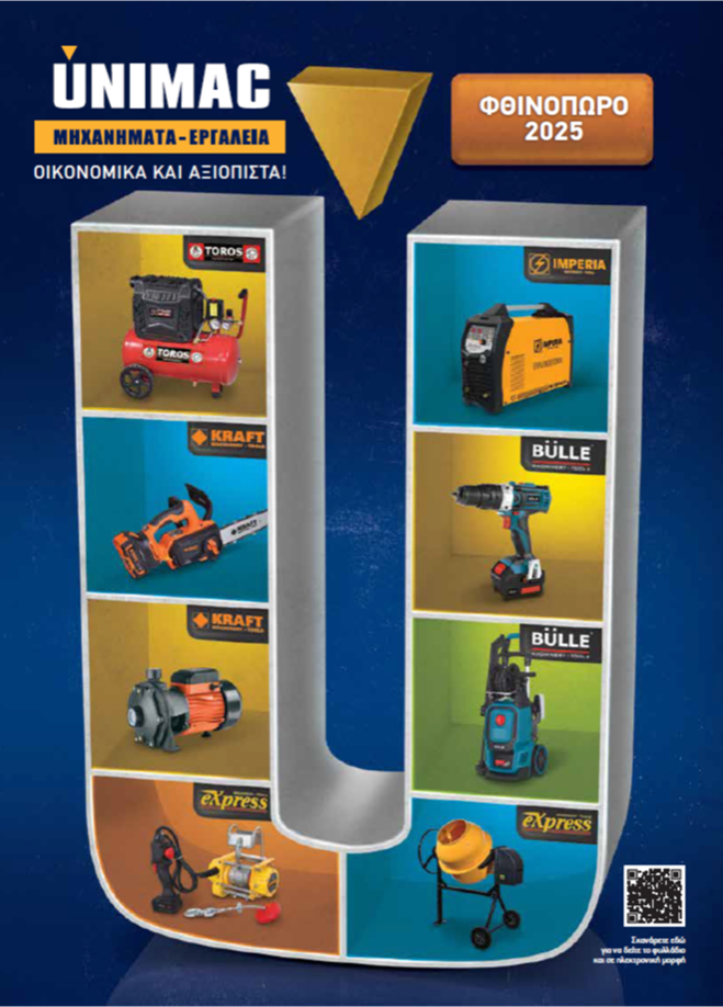Στο φυλλάδιο ΦΘΙΝΟΠΩΡΟ 2025 της UNIMAC θα βρείτε όλες τις προσφορές μηχανημάτων κι εργαλείων που παρουσιάζει η εταιρία για τα προιόντα της.