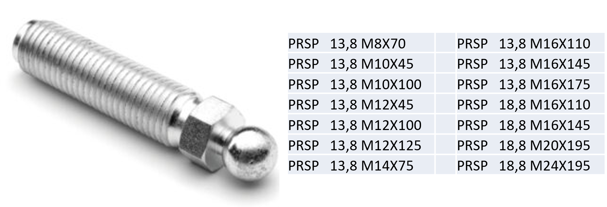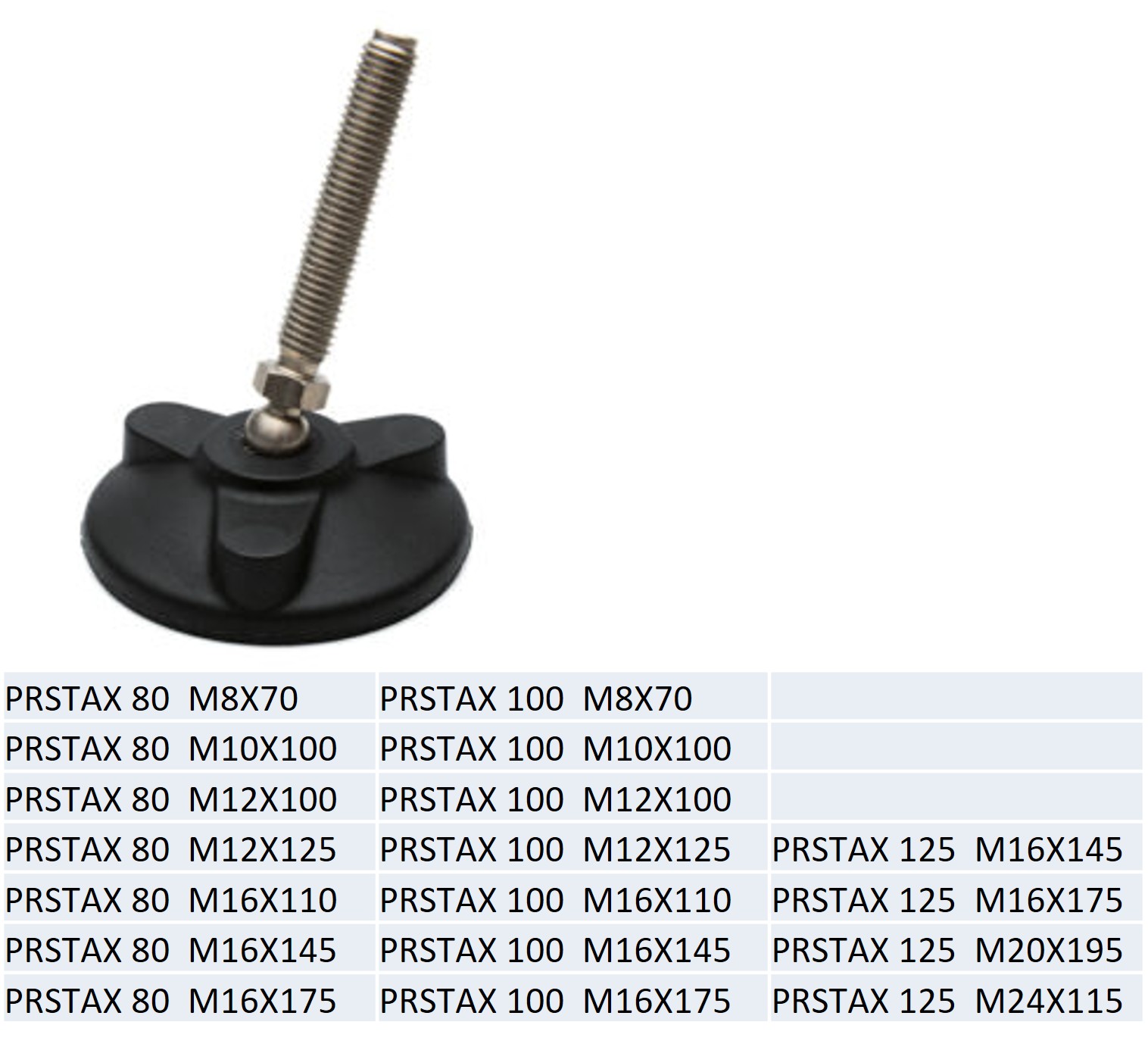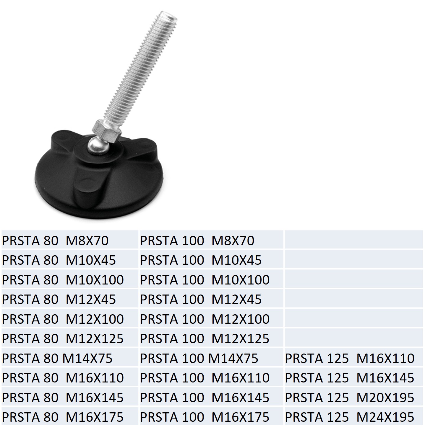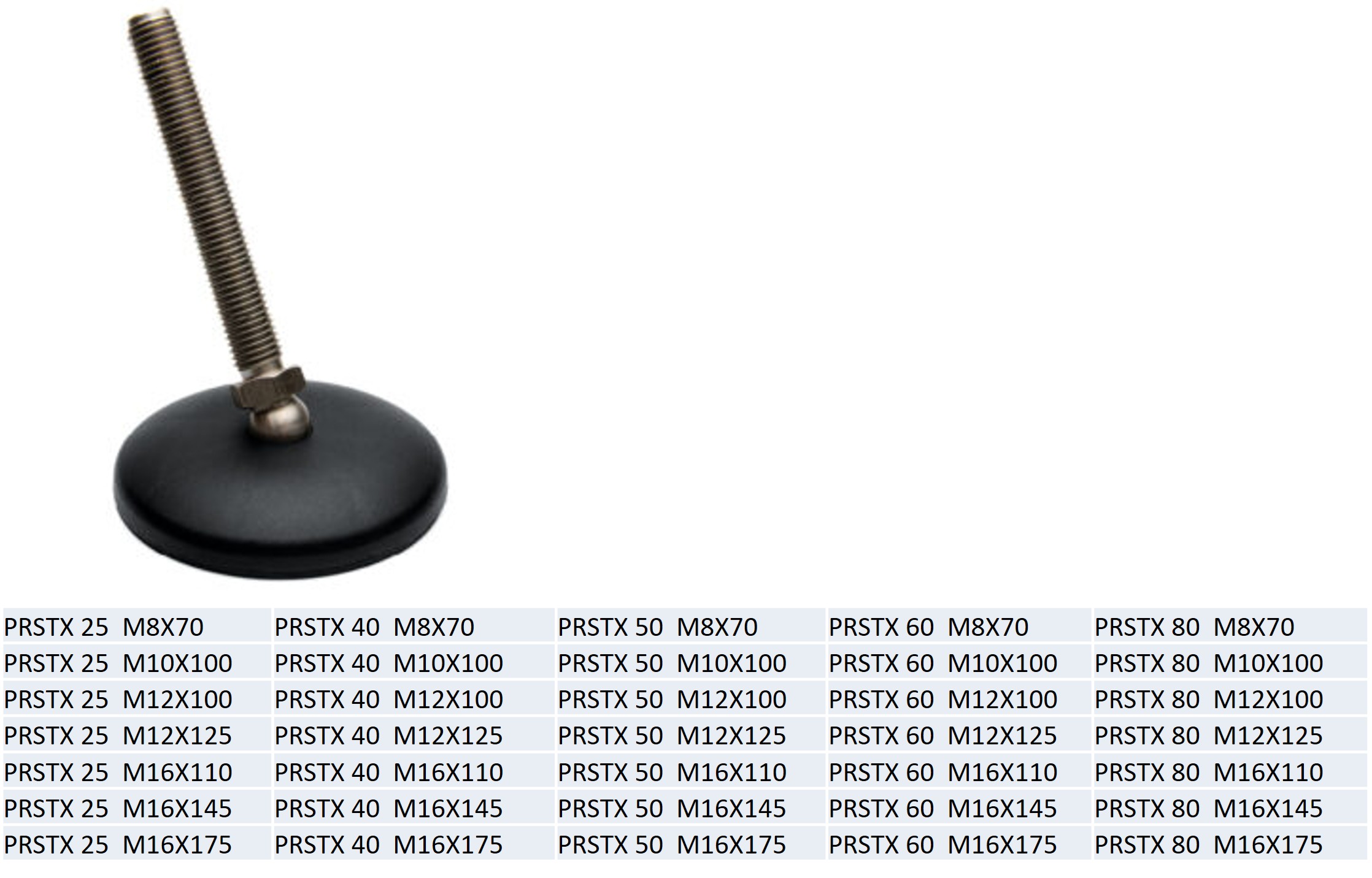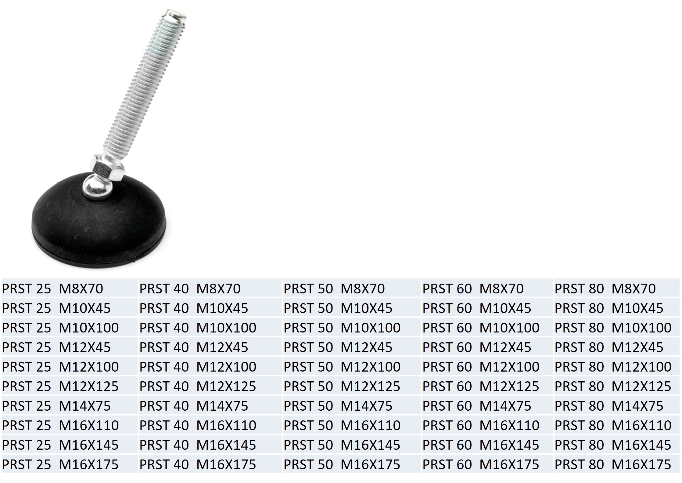 1) Από την περιγραφή του τύπου, προκύπτουν κι οι διαστάσεις. π.χ. PRST 25 M8X70 έχει διάμετρο πέλματος 25mm και βίδα Μ8 με μήκος σπειρώματος 70mm